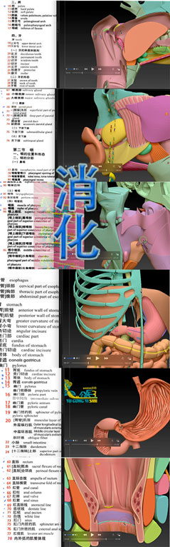 | 1 消化系统(alimentary system, digestive apparatus) 2 消化管(alimentary canal) 3 消化腺(alimentary gland) 第一节 口腔 口腔(oral cavity) 1 口腔前庭(oral vestibule) 2 固有口腔(oral cavity proper) 一、口唇 3 口唇(oral lips) 4 人中(philtrum) 5 口角(angle of mouth) 6 鼻唇沟(nasolabial sulcus) 二、颊 7 颊(cheek) 8 颊脂体(buccal fat pad) 9 腮腺管乳头(papilla of parotid duct) 三、腭 10 腭(palate) 11 硬腭(hard palate) 12 软腭(soft palate) 13 腭帆(velum palatinum, palatine velum) 14 腭垂(uvula) 15 腭舌弓(palatoglossal arch) 16 腭咽弓(palatopharyngeal arch) 17 咽峡(isthmus of fauces) 四、牙 牙(teeth) 18 上牙弓(upper dental arch) 19 下牙弓(lower dental arch) (一)牙的种类和排列 20 乳牙(deciduous tooth) 21 恒牙(permanent tooth) 22 迟牙(wisdom tooth) 23 切牙(incisor) 24 尖牙(canine toothe) 25 前磨牙(premolar) 26 磨牙(molar) (二)牙的形态 27 牙冠(crown of tooth) 28 牙颈(neck of tooth) 29 牙根(root of tooth) 30 牙冠腔(pulp chamber) 31 牙根管(root canal, pulp canal) 32 牙根尖孔(apical foramen) 33 牙腔(dental) 34 牙髓(dental pulp) (三)牙组织 35 牙质(dentine of tooth) 36 牙骨质(cement, cementum) 37 釉质(enamel) (四)牙周组织 38 牙周膜(periodontal membrane, periodontium) 39 牙槽骨(alveolar bone) 40 牙龈(gum, gingiva) 五、舌 舌(tongue) (一)舌的形态 41 舌体(body of tongue) 42 舌根(root of tongue) 43 舌背(dorsum of tongue) 44 舌尖(apex of tongue) 45 界沟(terminal sulcus) 46 舌盲孔(foramen cecum of tongue) (二)舌黏膜 47 舌黏膜(lingual mucous membrane) 48 舌系带(frenulum of tongue) 49 味蕾(taste bud) 50 舌乳头(papilla of tongue, lingual papilla) 51 丝状乳头(filiform papilla) 52 菌状乳头(fungiform papilla) 53 轮廓乳头(vallate papilla) 54 叶状乳头(foliate papilla) 55 舌正中沟(median sulcus of tongue) 56 舌扁桃体(lingual tonsil) 57 舌下阜(sublingual caruncle) 舌下襞(sublingual fold) (三)舌肌 舌肌(muscle of tongue) 舌内肌(intrinsic lingual muscles) 58 舌垂直肌(vertical muscle of tongue) 59 舌横肌(transverse muscle of tongue) 60 [舌] 上纵肌(superior longitudinal muscle) [舌] 下纵肌(inferior longitudinal muscle) 61 舌外肌(extrinsic lingual muscles) 62 颏舌肌(genioglossus) 63 舌骨舌肌(hyoglossus) 64 颏舌骨肌(geniohyoid) 65 茎突舌肌(styloglossus) 66 下颌舌骨肌(mylohyoid) 六、唾液腺 67 唾液腺(salivary gland) 68 小唾液腺(minor salivary glands) 69 大唾液腺(major salivary glands) (一)腮腺 70 腮腺(parotid gland) 71 a [腮腺] 浅部(superficial part of parotid gland) 72 b [腮腺] 深部(deep part of parotid gland) 73 腮腺管(parotid duct) 74 副腮腺(accessory parotid gland) (二)下颌下腺 75 下颌下腺(submandibular gland) (三)舌下腺 76 舌下腺(sublingual gland) 第二节 咽 一、咽的位置和形态 二、咽的分部 (一)鼻咽 77 鼻咽(nasopharynx, nasal part of pharynx) 78 咽鼓管咽口(pharyngeal opening of auditory tube) 79 咽鼓管圆枕(tubal torus, torus tubarius) 80 咽隐窝(pharyngeal recess) 81 咽鼓管扁桃体(tubal tonsil) 82 腭扁桃体(pharyngeal tonsil) (二)口咽 83 口咽(oropharynx, oral part of pharynx) 84 舌会厌正中襞(median glossoepiglottic fold) 85 会厌谷(epiglottic vallecula) 86 腭扁桃体(palatine tonsil) 87 扁桃体窝(tonsillar fossa) 88 扁桃体小窝(tonsillar fossula) 89 扁桃体上窝(supratonsillar fossa) 90 咽淋巴环(pharyngeal lymph ring) (三)喉咽 91 喉咽(laryngopharynx) 92 梨状隐窝(piriform recess) (四)咽壁肌 咽肌(muscle of pharynx) 93 咽缝(raphe of pharynx) 94 咽上缩肌(superior constrictor of pharynx) [咽上缩肌] 翼咽部(pterygopharyngeal part of superior constrictor of pharynx) [咽上缩肌] 颊咽部(buccopharyngeal part of superior constrictor of pharynx) [咽上缩肌] 下颌咽部(mylopharyngeal part of superior constrictor of pharynx) [咽上缩肌] 舌咽部(glossopharyngeal part of superior constrictor of pharynx) 95 咽中缩肌(middle constrictor of pharynx) [咽中缩肌] 小角咽部(chondropharyngeal part of middle constrictor of pharynx) [咽中缩肌] 大角咽部(ceratopharyngeal part of middle constrictor of pharynx) 96 咽下缩肌(inferior constrictor of pharynx) [咽下缩肌] 甲咽部(thyropharyngeal part of inferior constrictor of pharynx) [咽下缩肌] 环咽部(cricopharyngeal part of inferior constrictor of pharynx) 97 茎突咽肌(stylopharyngeus) 98 咽鼓管咽肌(salpingopharyngeus) a 咽鼓管软骨(cartilage of auditory tube) 99 腭咽肌(palatopharyngeus) b 腭舌肌(palatoglossus) c 腭帆提肌(levator veli palatini) d 腭帆张肌(tensor veli palatini)食管(esophagus)
